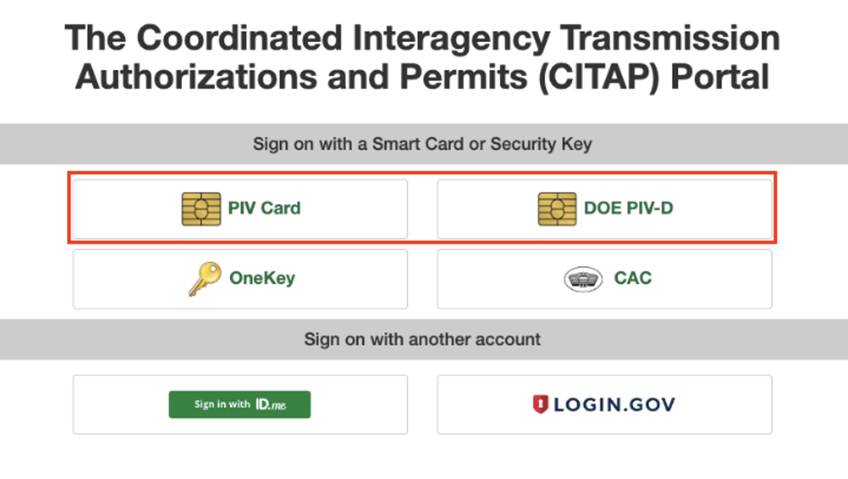 Some agencies support the use of Personal Identity Verification (PIV) cards in this platform. Hover over the "PIV Card" tile to see the list of accepted agencies. If your agency is included in the list, you can follow the sign in prompts or continue to the next steps.